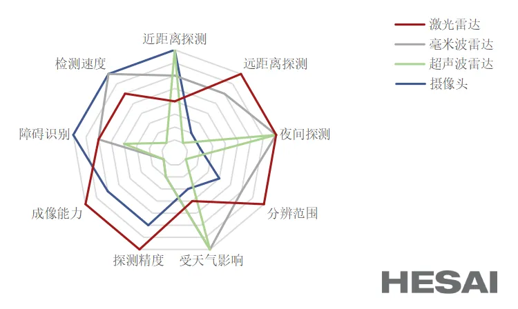 从下图可以看出,摄像头、毫米波雷达、激光雷达各有其不同的特性,但很明显,有了激光雷达的加持,智能汽车将成为一个“九边形”战士,拥有更高的安全冗余,实现更安全、更智能的行驶体验。