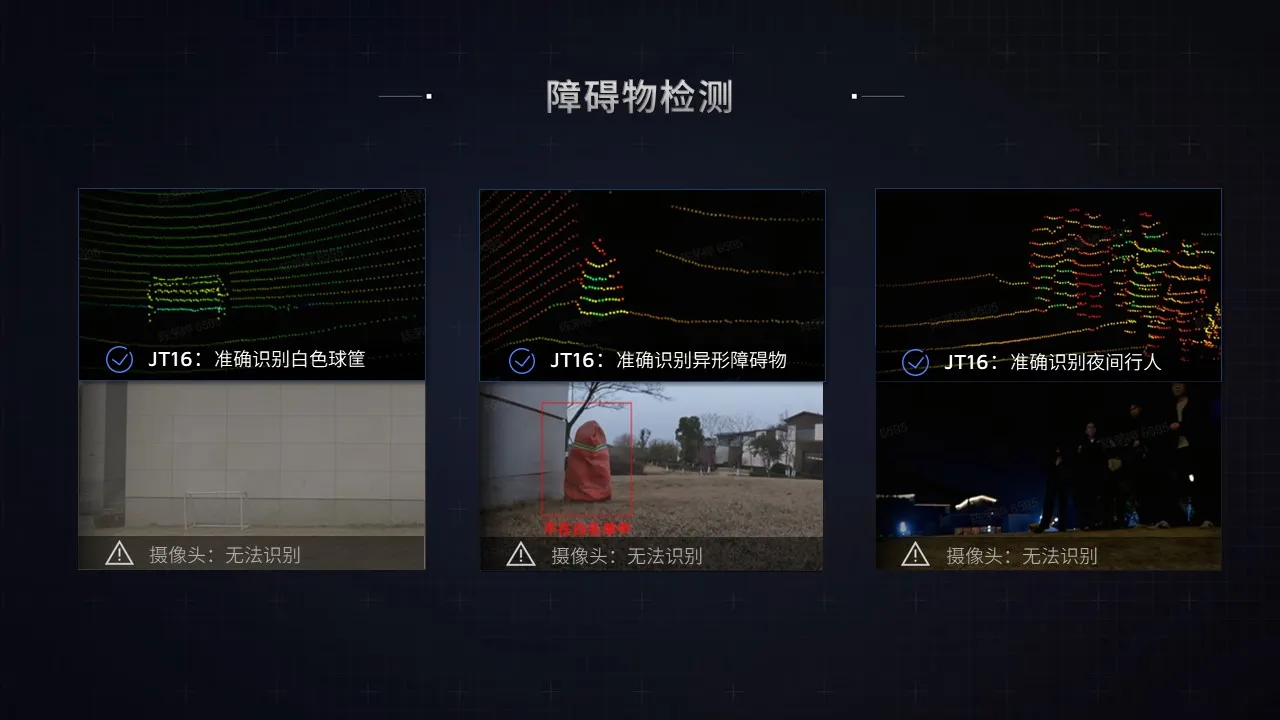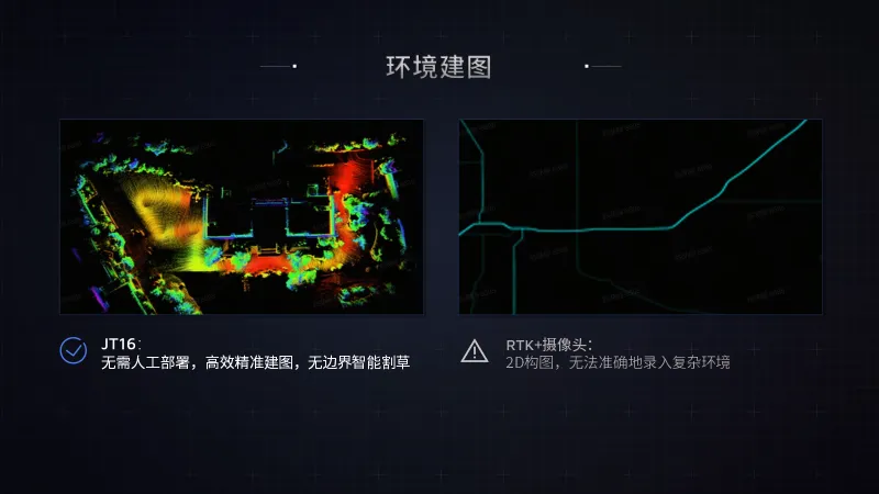 激光雷达通过主动发激光实现三维测距,不受环境光影响。因此无论是夜间作业,还是识别不在白名单中的异形障碍物或颜色相近物体,JT16 都能精准实时感知,帮助割草机在复杂环境中实现更快更稳的主动应变能力,实现全向动态避障。而 RTK + 摄像头方案易受环境光影响,在夜间对障碍物的识别率大幅下降,存在一定的作业安全隐患。