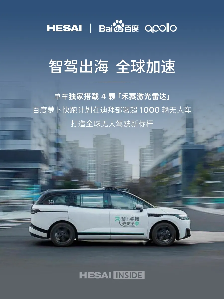33 月 28 日,萝卜快跑宣布在迪拜市区率先开展无人驾驶规模化测试和服务,将在迪拜部署超过 1000 辆全无人驾驶汽车,单车独家搭载 4 颗「禾赛激光雷达」。这也是萝卜快跑首次在中国以外的地区开展无人驾驶规模化测试和服务。