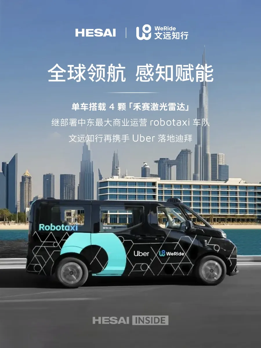 2024 年 12 月,文远知行与 Uber 合作,正式在阿联酋首都阿布扎比落地 robotaxi 自动驾驶出行服务,标志着 Uber 平台首次在美国以外地区上线自动驾驶车辆,同时也是美国和中国之外规模最大的商业运营 robotaxi 车队。此次落地迪拜,标志着文远知行和 Uber 的合作正式拓展至中东市场第 2 座城市。作为其激光雷达合作伙伴,禾赛将助力文远知行为全球数百万用户提供流畅、友好的自动驾驶出行体验。