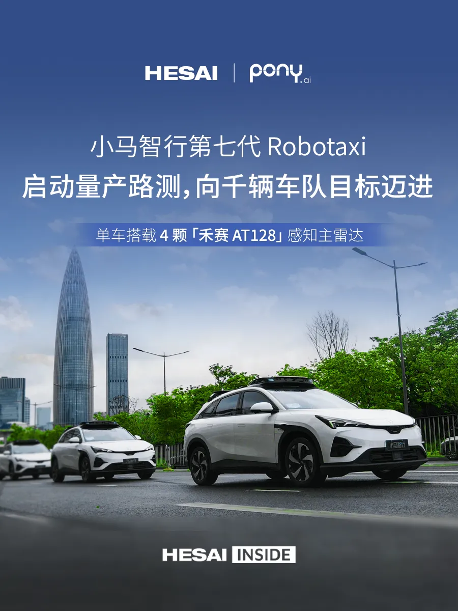 近日,小马智行宣布搭载其第七代自动驾驶系统的北汽极狐阿尔法 T5 Robotaxi 在深圳开启道路测试,该车型搭载 4 颗禾赛 AT128 作为感知主雷达,为其规模化部署提供行业领先的感知能力支撑。这一里程碑事件标志着小马智行向 2025 年底前车队规模扩至千辆的目标迈出关键一步。