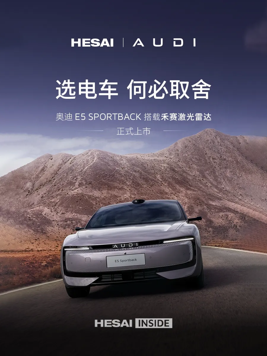 奥迪 E5 Sportback 深度融合奥迪“突破科技·启迪未来”的品牌基因与中国顶尖科技,以“美美与共”的合作哲学,精准契合中国新一代菁英用户对豪华电动出行的全新期待,是传统豪华品牌在新能源赛道第一次全力以赴。未来,禾赛科技将持续深化与奥迪汽车的战略合作,持续助力传统豪华品牌在新能源赛道的转型和革新。