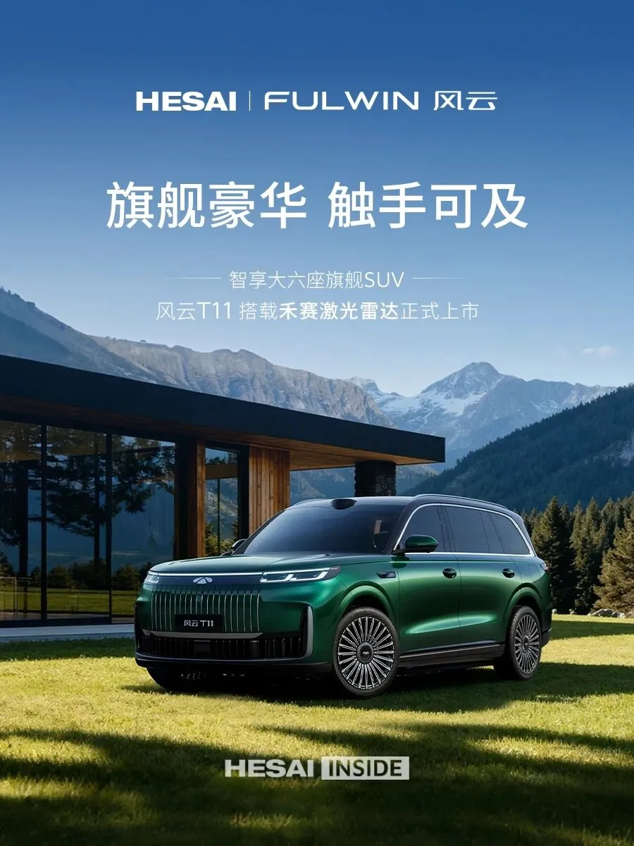 2025 年 10 月 30 日,智享大六座旗舰 SUV 奇瑞风云 T11 全球上市,推出 220 后驱伯牙巨幕奢享版、220 后驱双 IMAX 影院版、220 四驱双 IMAX 影院版、220 四驱全家乐 4 款车型,限时 17.99 万元起,其中 220 四驱全家乐搭载禾赛激光雷达。风云 T11 预售以来,已经锁单 28732 台!