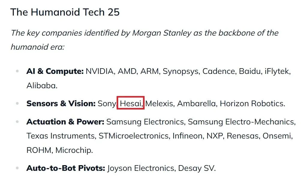 全球激光雷达行业领导者禾赛科技(NASDAQ: HSAI;HKEX: 2525)近日成功入选摩根士丹利重磅发布的“Humanoid Tech 25(人形机器人科技 25 强)”榜单。该榜单聚焦全球最具影响力的 25 家机器人及相关技术企业,禾赛凭借为机器人在真实物理世界中规模化落地提供关键三维感知能力而获得高度认可,成为全球唯一入选的激光雷达公司。