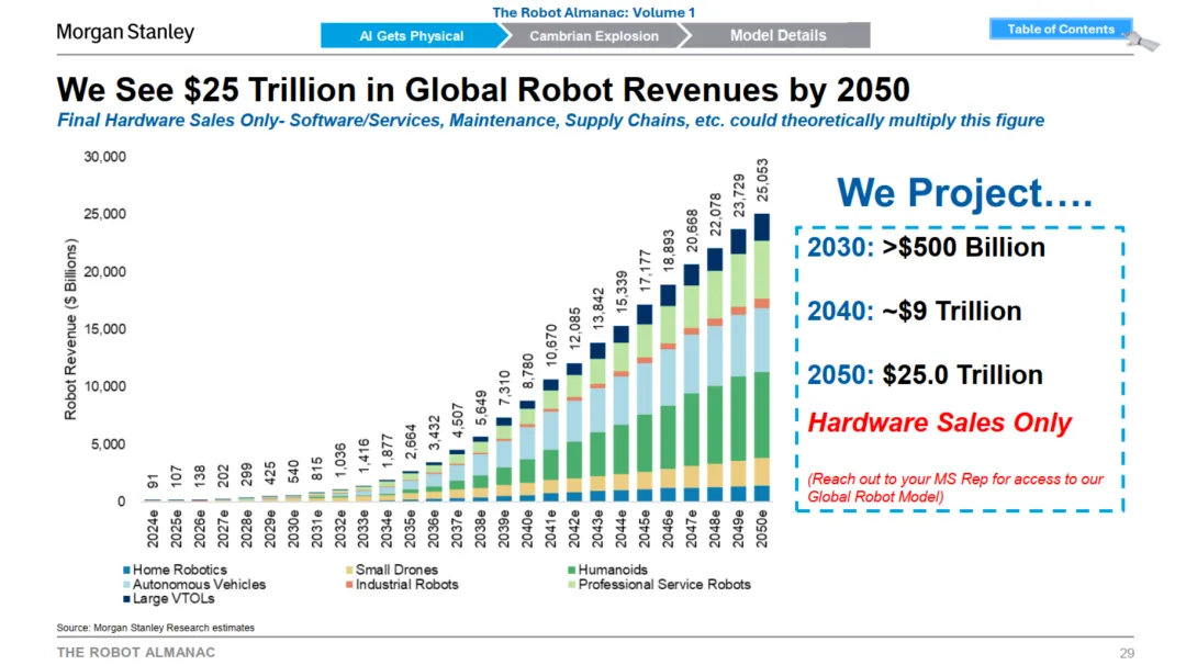 到 2050 年,全球机器人硬件市场规模有望达到 25 万亿美元
