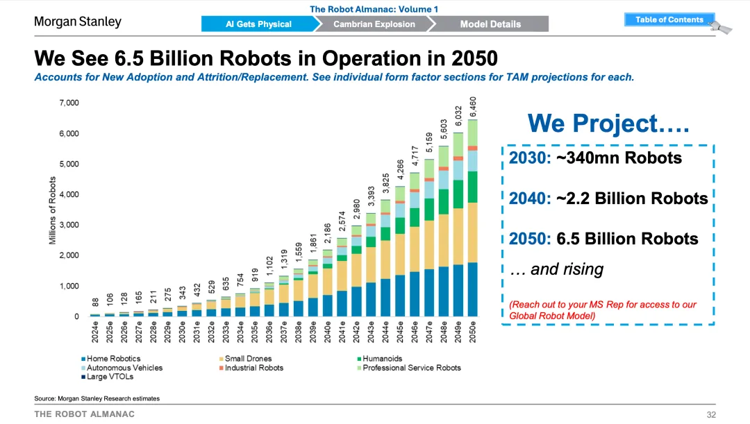 同时,摩根士丹利通过其全球机器人模型(GROM)预测,到 2050 年全球将销售 14 亿台机器人,运行中的机器人总数将达到 65 亿台。机器人形态将高度多样化,包括工业机器人、服务机器人、无人机、自动驾驶车辆、类人机器人、家用机器人等,覆盖从制造业到医疗、农业、交通、空间探索等各类应用场景。