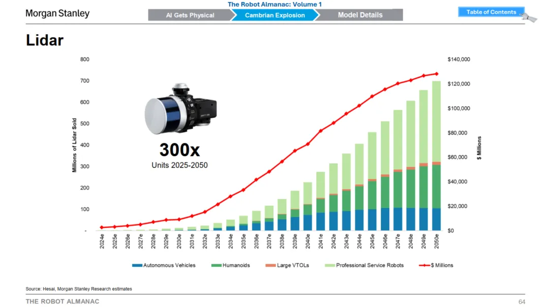 摩根士丹利预测,到 2050 年,为满足 14 亿台机器人对环境感知的需求,全球激光雷达的需求量将达到约 7 亿颗,较 2025 年需求规模将增长近 300 倍,释放出极具想象空间的长期市场机遇。
