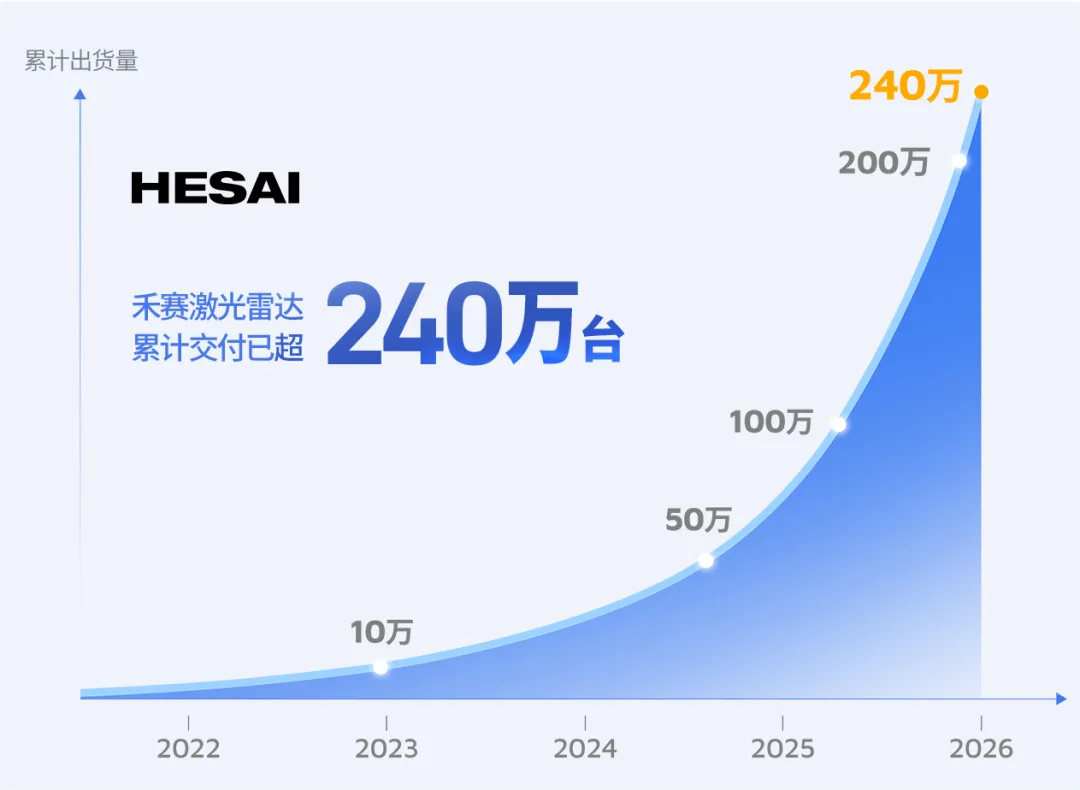 禾赛已连续五年全年交付量翻番。2025 年,禾赛全年交付量超 160 万台,单月最高交付量超 20 万台,ADAS 产品全年交付量约 140 万台,机器人产品全年交付量超 20 万台,爆款产品 ATX 开启交付首年即突破 100 万台,全系激光雷达产品历史累计交付量已超 240 万台。