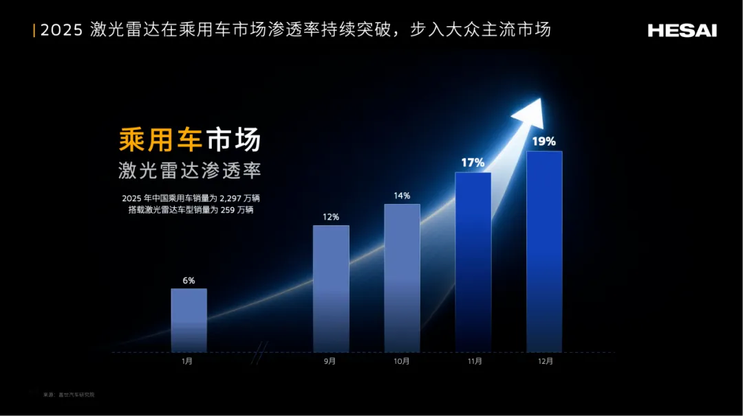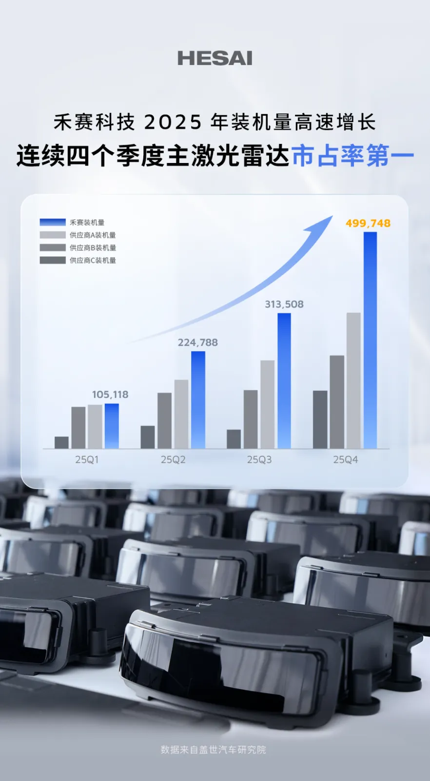 据盖世数据,2025 年,中国乘用车市场主激光雷达总装机量为 275.6 万台,禾赛贡献 114.3 万台,装机量是行业第二名的近 1.5 倍、第三名的近 2 倍。目前,禾赛激光雷达总装机量已连续 5 年翻番,在中国乘用车市场装机量同比提升近 3 倍,持续领跑规模化量产赛道。