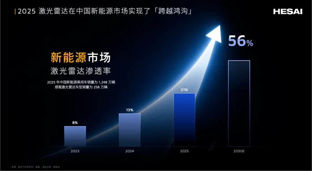2025 年,激光雷达行业已进入到“跨越鸿沟”[2]关键节点。据盖世数据,2025 年新能源乘用车销量为 1248 万辆,搭载激光雷达车型销量为 258 万辆,激光雷达渗透率高达 21%,单月最高达 28%,相当于每四辆新能源新车就有一辆配备激光雷达。尤其值得关注的是,2025 年 11 月至 12 月,激光雷达在整个乘用车市场的渗透率已达 17%-19%,首次跨越 16%的“鸿沟临界点”,标志着激光雷达技术已完成早期市场到主流市场的关键跃迁,正式进入规模化普及新阶段。行业预测,至 2030 年,激光雷达在新能源车中的渗透率有望提升至 56%,市场规模将持续“倍增”[3]。